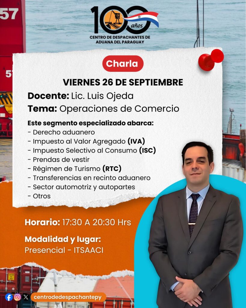 El Centro de Despachantes de Aduana del Paraguay, en el marco de sus actividades de capacitación y actualización profesional, tiene el honor de invitar a todos sus asociados a la Charla sobre Operaciones de Comercio, que estará a cargo del Lic. Luis Ojeda.